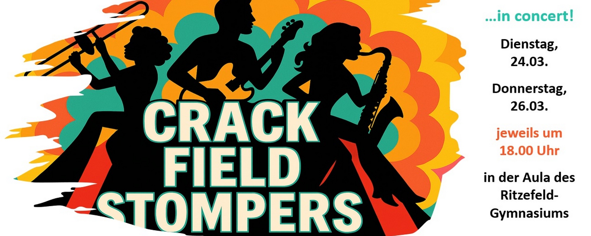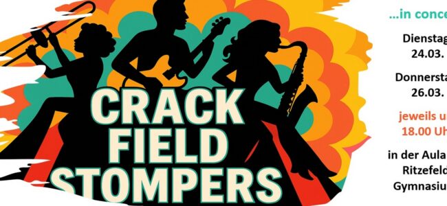 Bigbandkonzerte 2026 250316. Die Crack Field Stompers vom "Ritze" spielen für Schüler, Lehrer, Familien und Musikfans! Wann? Dienstag, 24.03.2026 und Donnerstag, 26.03.2026, jeweils ab 18:00 Uhr. Wo?...