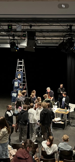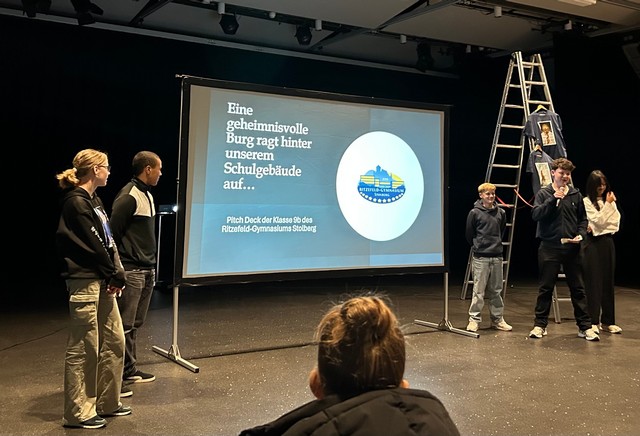 Anschließend wurde es für die 9b aufregend, denn nun sollten die „Pitch Decks“ der verschiedenen Schülergruppen präsentiert werden. In Lehrvideos von Herrn Voloj hatte die Klasse vorher erfahren, dass es sich dabei um einen Planungsentwurf handelt, mit dem ein Autor oder eine Autorin einen Verleger oder eine Verlegerin von seinem/ihrem Projekt überzeugen will und den Auftrag erhalten, ein Pitch Deck zu einer eigenen Graphic Novel zu entwerfen. Die Klasse 9b hat sich dazu eine Zeitreisegeschichte rund um die Stolberger Burg ausgedacht, die sie samt Story, Hauptfiguren und ersten Zeichnungen den anwesenden Künstlern und dem Schülerpublikum vorstellten.