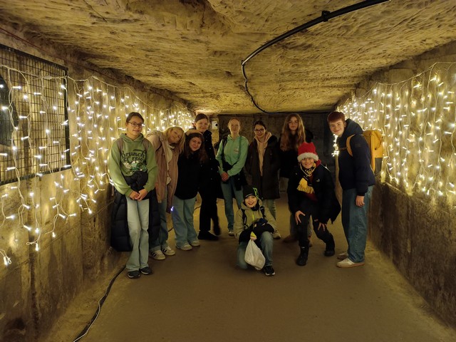 251204. Am heutigen Tag gingen die zehn TeilnehmerInnen der Euregio-AG bei schönstem Winterwetter erneut auf Exkursion. Diesmal ging es mit der Bahn nach Valkenburg, in die Weihnachtsstadt der Niederlande.
