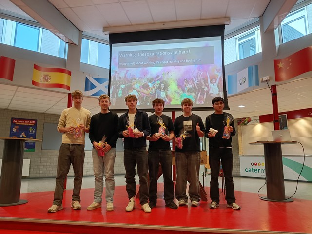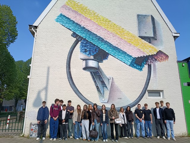 Direkt nach der einstündigen Steetart-Tour ging es zu Fuß weiter zum Sintermeertencollege, wo uns die niederländischen Schüler und Lehrkräfte bereits mit Getränken und leckerer Pizza erwarteten. Das Besondere: Einge der Schüler waren sich bereits vier Jahre zuvor auf einem Austauschtag begegnet und feierten nun ihr Wiedersehen. Ingmar Moust hatte ein spannendes und informatives Quiz vorbereitet, das die Schüler in gemischten Gruppen gegeneinander spielten. Einige Fragen waren dabei ganz schön knifflig! Nach einem schönen Abend ließen es sich einige Schüler im Anschluss nicht nehmen, noch einmal in die Stadt zu laufen, um sich Heerlen am Abend anzuschauen, bevor ein ereignisreicher Tag zuende ging.