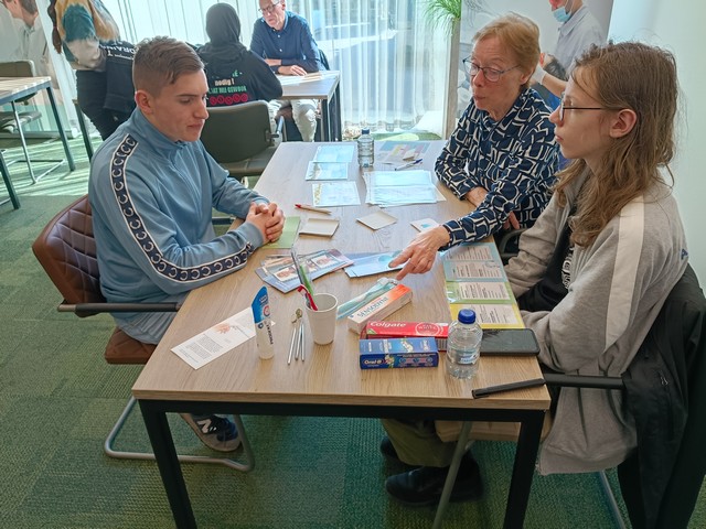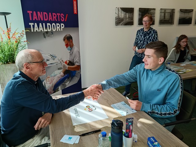 Am nächsten Morgen checkten wir früh aus unserer Unterkunft aus und zogen in die Stadt, um zu frühstücken. Im Anschluss ging es zurück zu Schunck, wo wir die Niederländisch-Schüler vom Goethe-Gymnasium Stolberg trafen. Dann machten sich die Schüler in Kleingruppen auf, das Taaldorp zu erkunden. An den 21 Stationen konnten sie dabei ihre niederländischen Sprachkenntnisse erproben. Besonders beliebt war auch dieses Jahr der Bäcker (Gebakkraam), bei dem es kostenlose Waffeln gab. Beim Geburtstagsfest mussten die Schüler dem Geburtstagskind gratulieren, beim Hausarzt ihre Beschwerden schildern und im Museum ein Gemälde beschreiben.