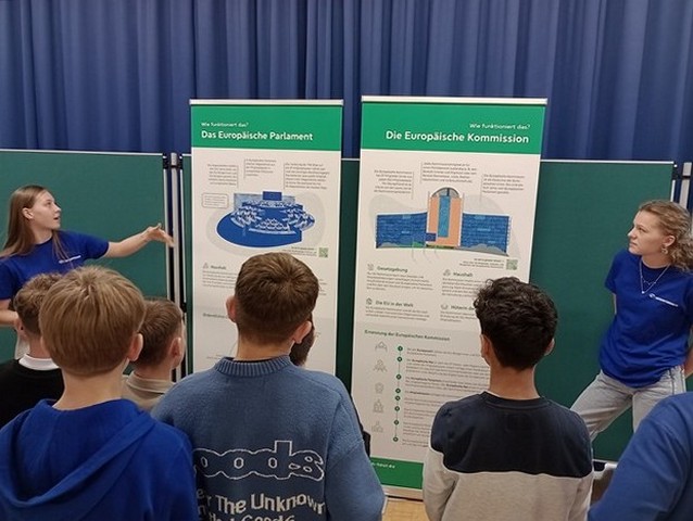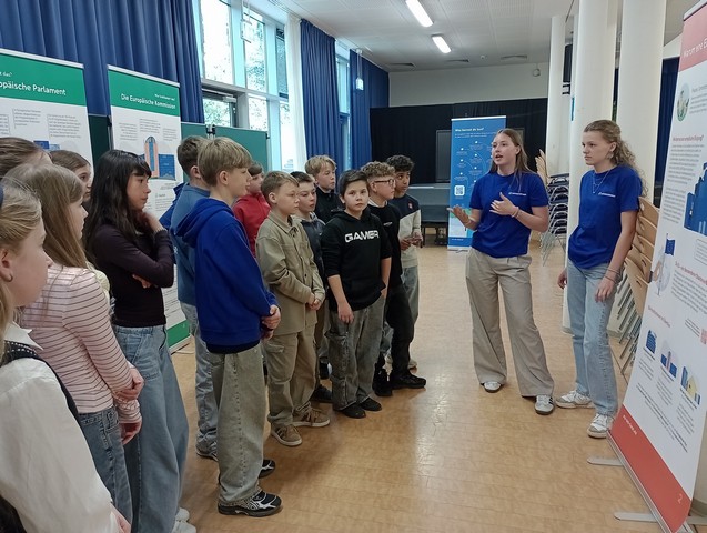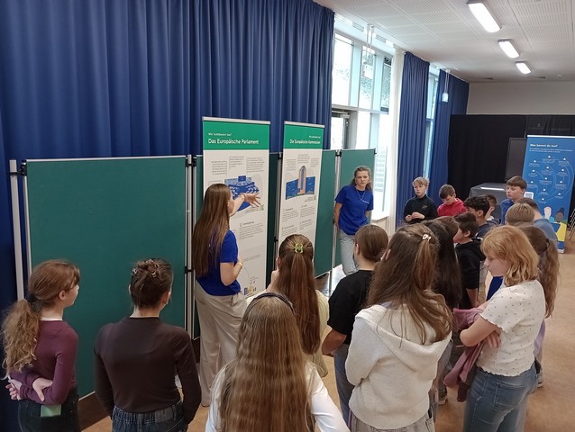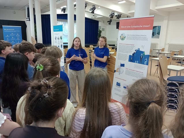 Als erstes größeres Projekt konnten unsere Juniorbotschafter den Schülern der 6. Klassen die Ausstellung „EU on Tour“ näherbringen. Diese Wanderausstellung geht der Frage nach: Wie funktioniert die Europäische Union und warum geht sie uns alle etwas an? Auf der Basis von mehreren Roll-Ups mit Informationen zur Europäischen Union haben unsere Juniorbotschafterinnen F. Jansen und L. Mojert (EF) die Schüler der 6. Klassen über die EU informiert, die auf diese Weise mit wichtigen Aspekten der Gemeinschaft in Kontakt kommen und einen Blick auf die Institutionen der EU (Parlament und Kommission) sowie die Handlungsfelder der EU werfen konnten.